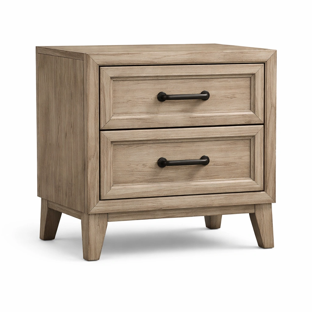 Mesita de noche de madera con dos cajones color madera clara