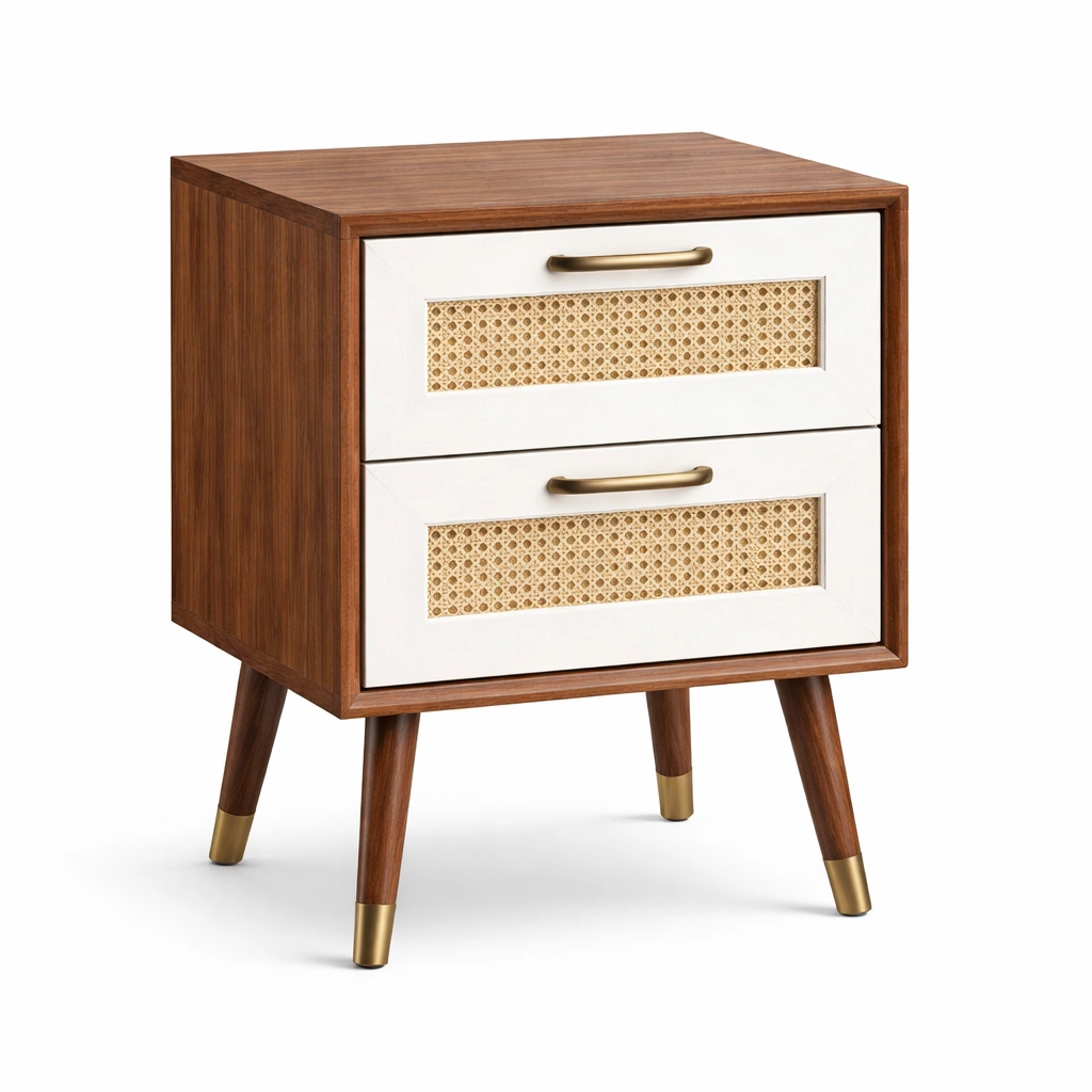Mesita de noche de madera con detalles de ratán y patas de metal
