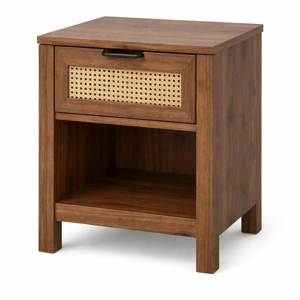 Mesita de noche de madera de nogal con cajón de ratán 40x30x50 cm